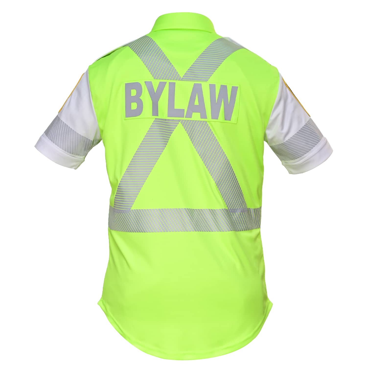 The rear features a large X-pattern reflective design, a common requirement for Canadian safety apparel. It also includes an additional wide horizontal reflective band around the back torso.