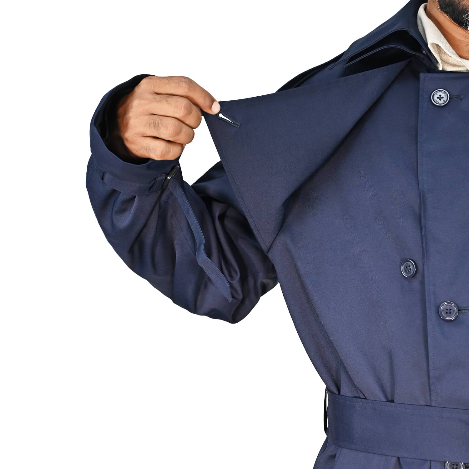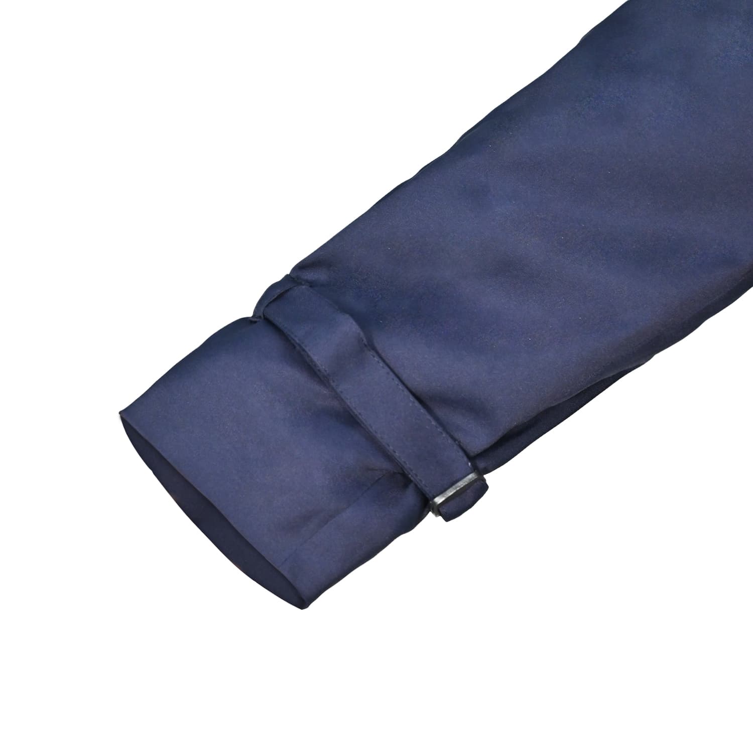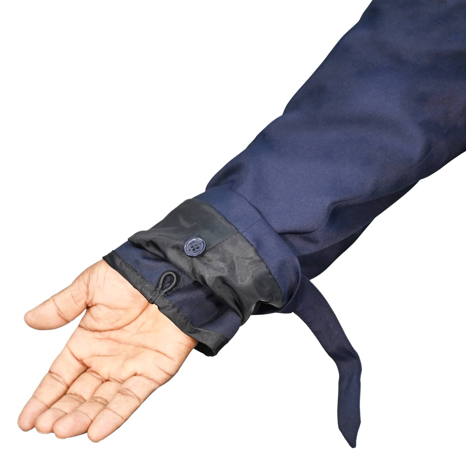 Outer cuff strap with an adjustable tab to tighten the sleeve opening for a tailored fit.