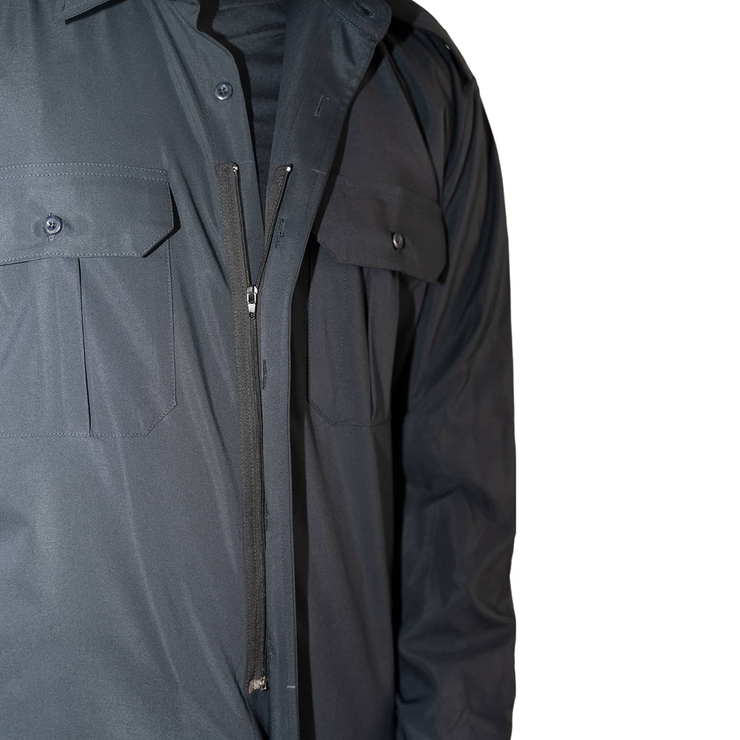 • Concealed Zipper Front Closure: Hidden zipper under the button placket allows for quick wear and removal, ensuring a clean, professional appearance.