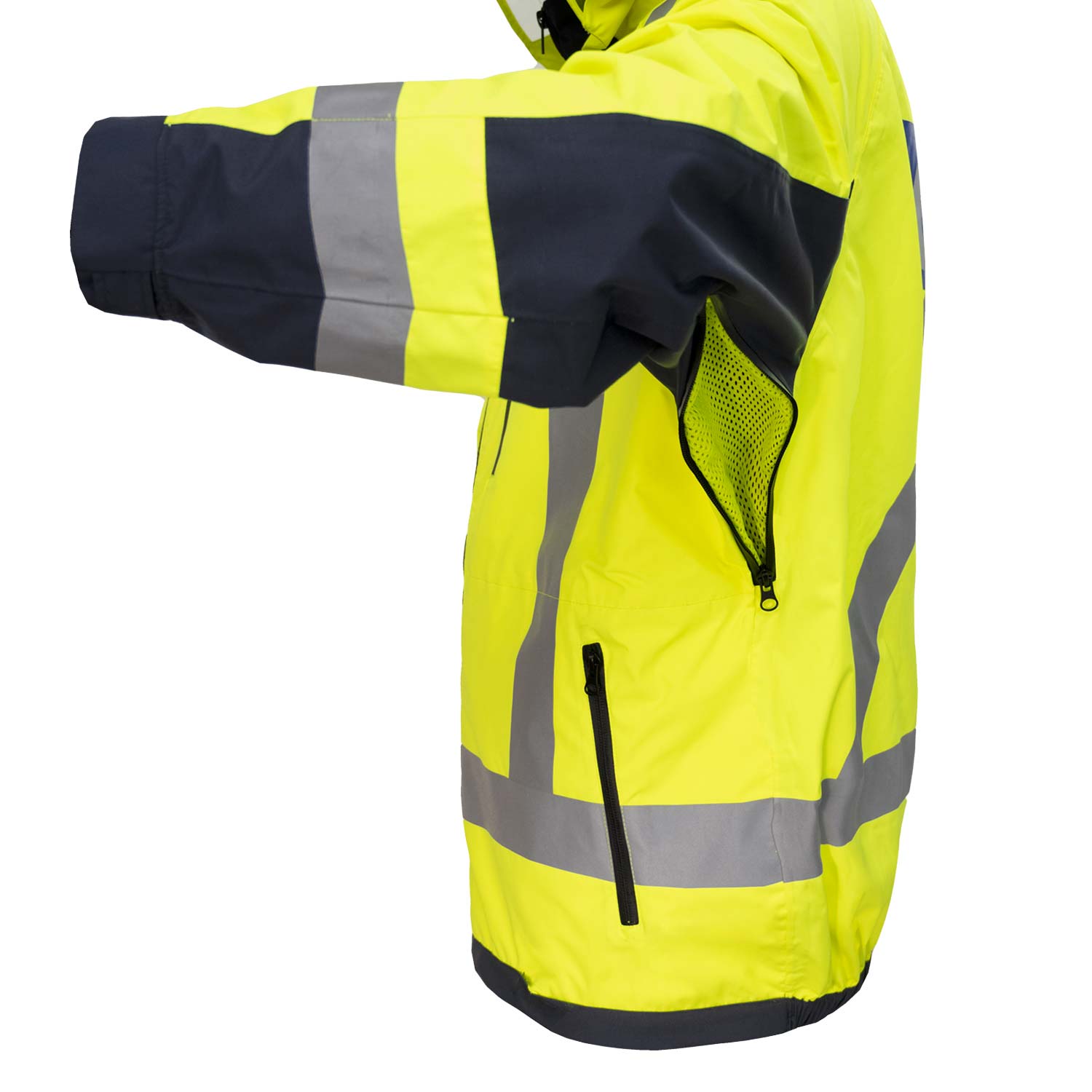 Fluorescent yellow outer shell designed for maximum visibility in day and night operations.