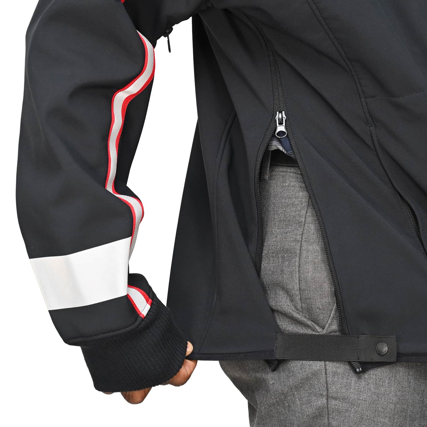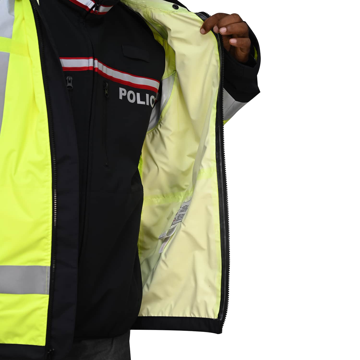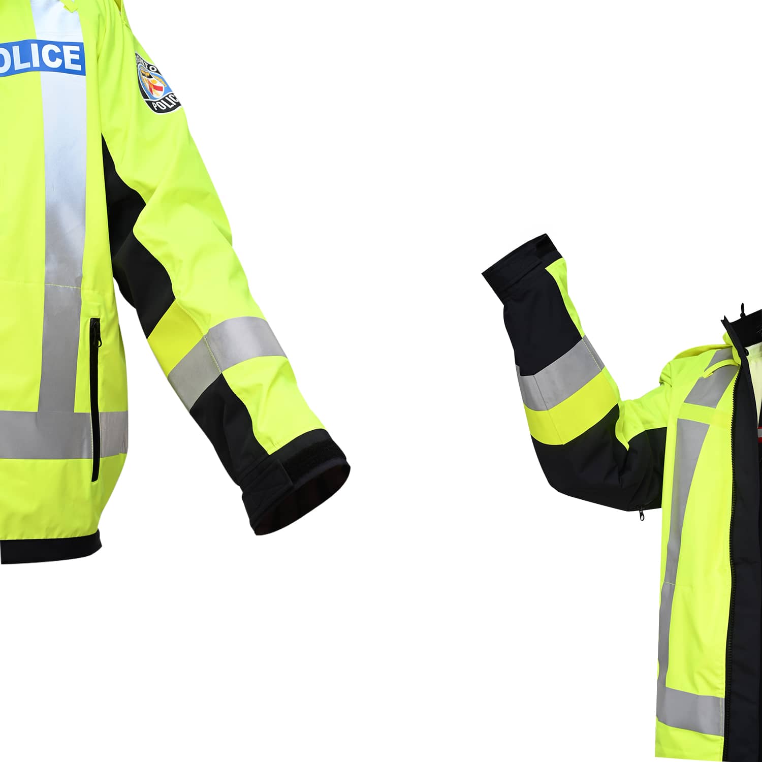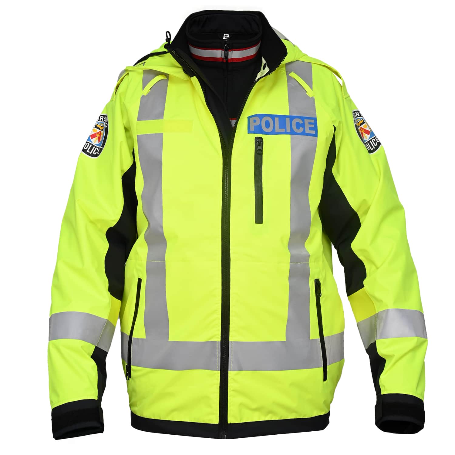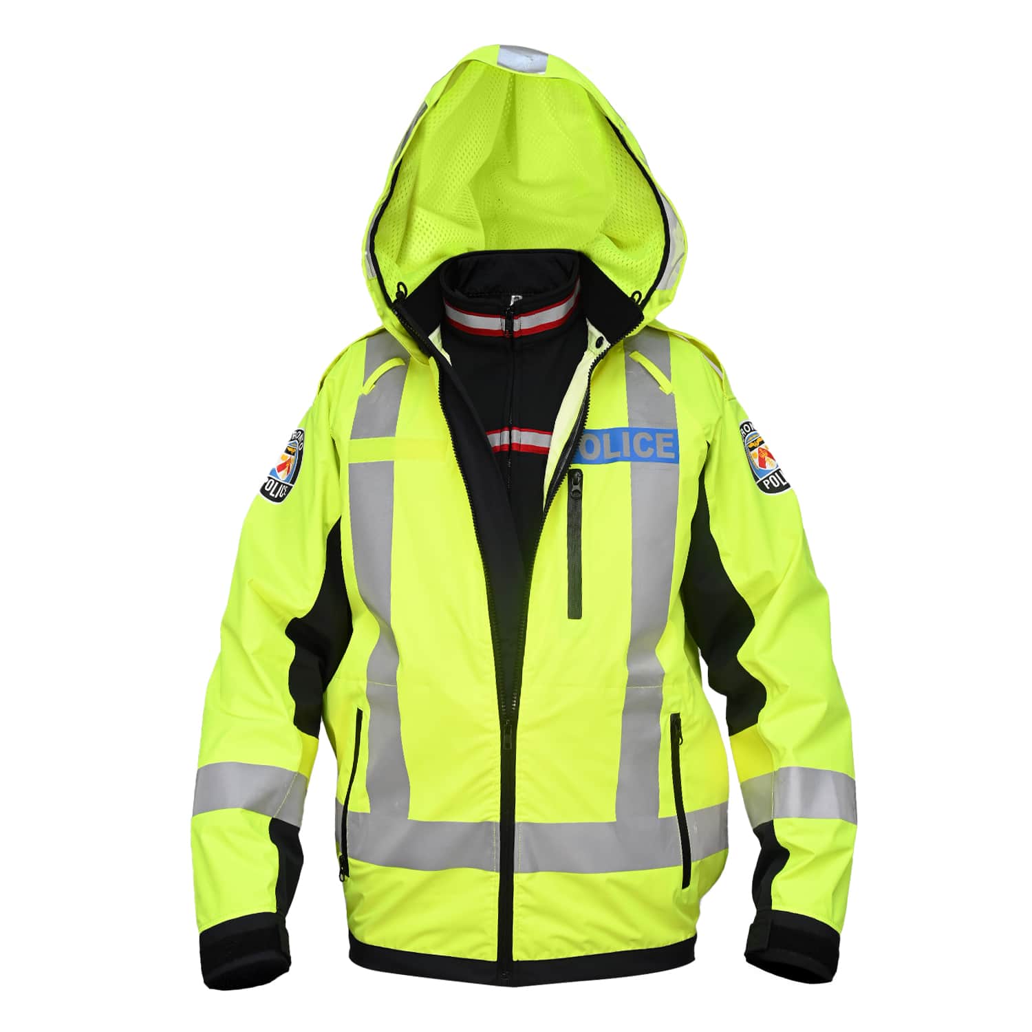 Designed for police operational needs, the jacket includes strategically placed zippered pockets: