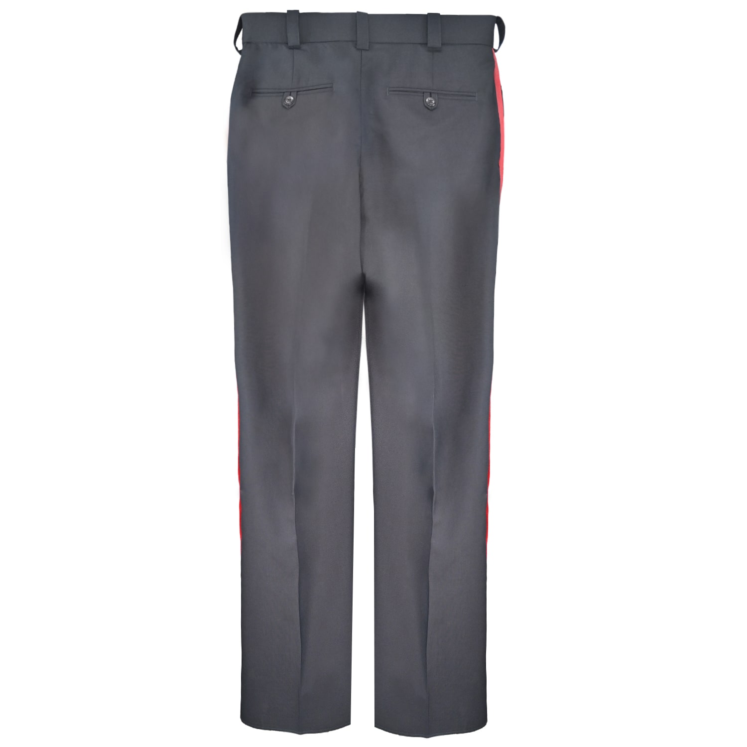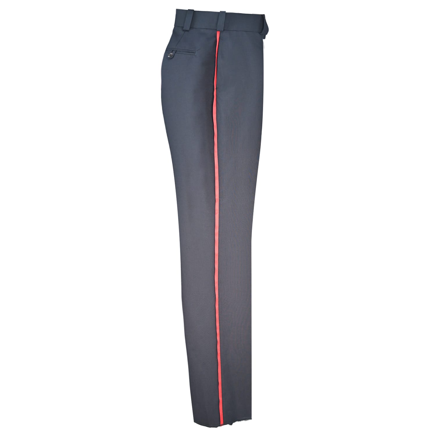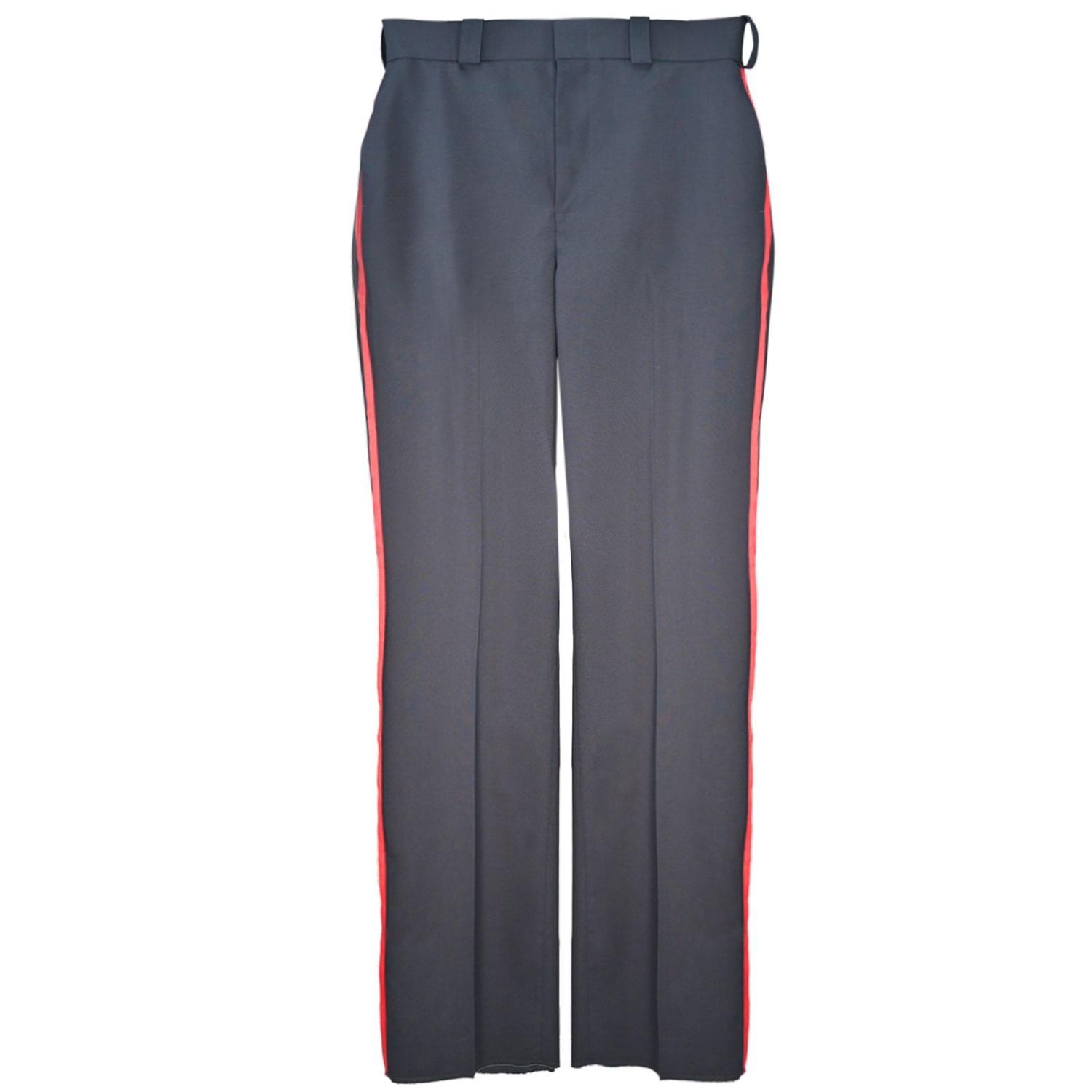 Features a bold red contrast stripe running cleanly down the outer side seams, adding a formal, authoritative look typical of service and dress uniforms. -