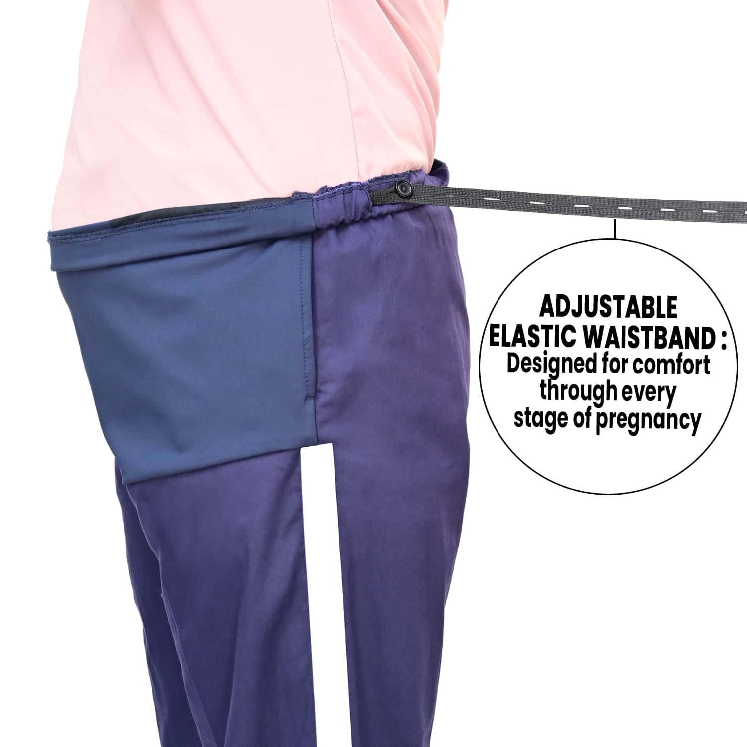 Features a wide, soft stretchy belly band in a contrasting fabric (navy blue).